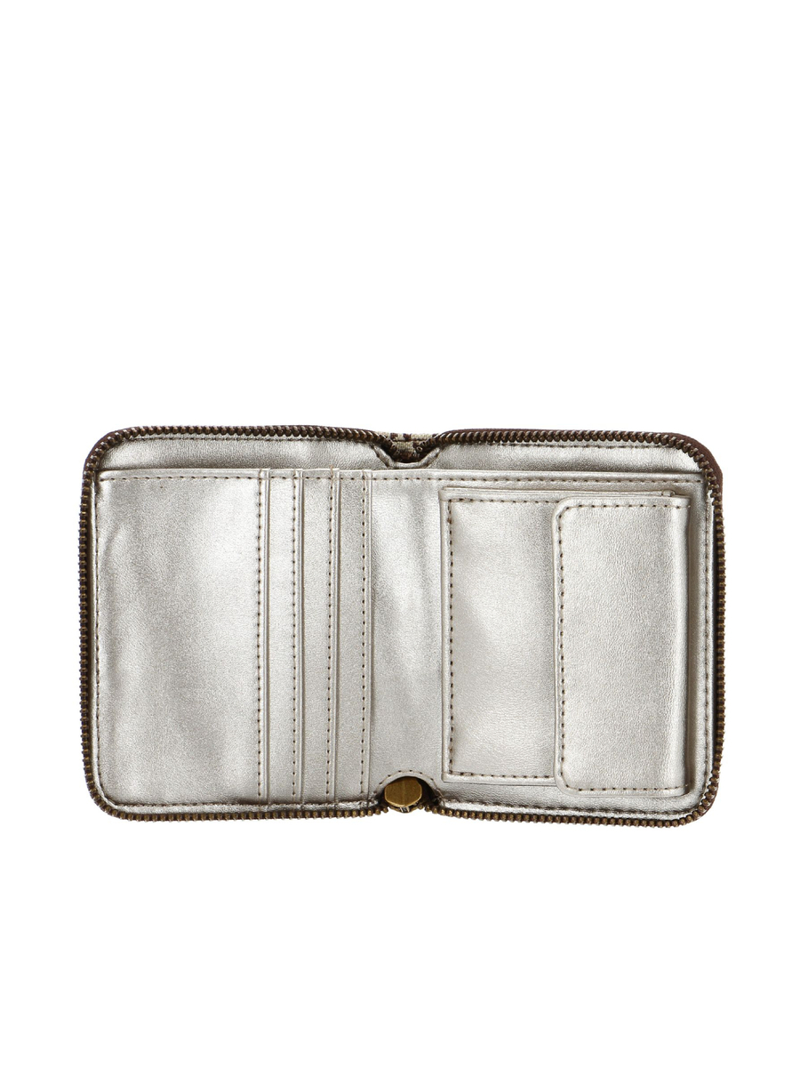 Peněženka má jednu kapsu na bankovky, čtyři přihrádky na karty a kapsičku na drobné zapínací na druk.