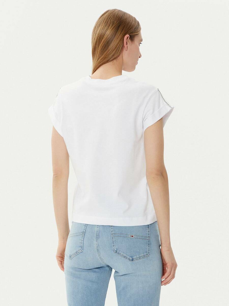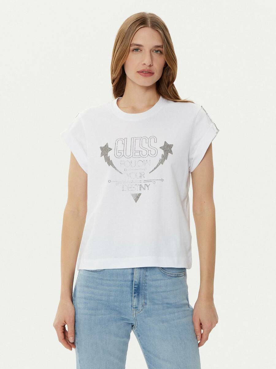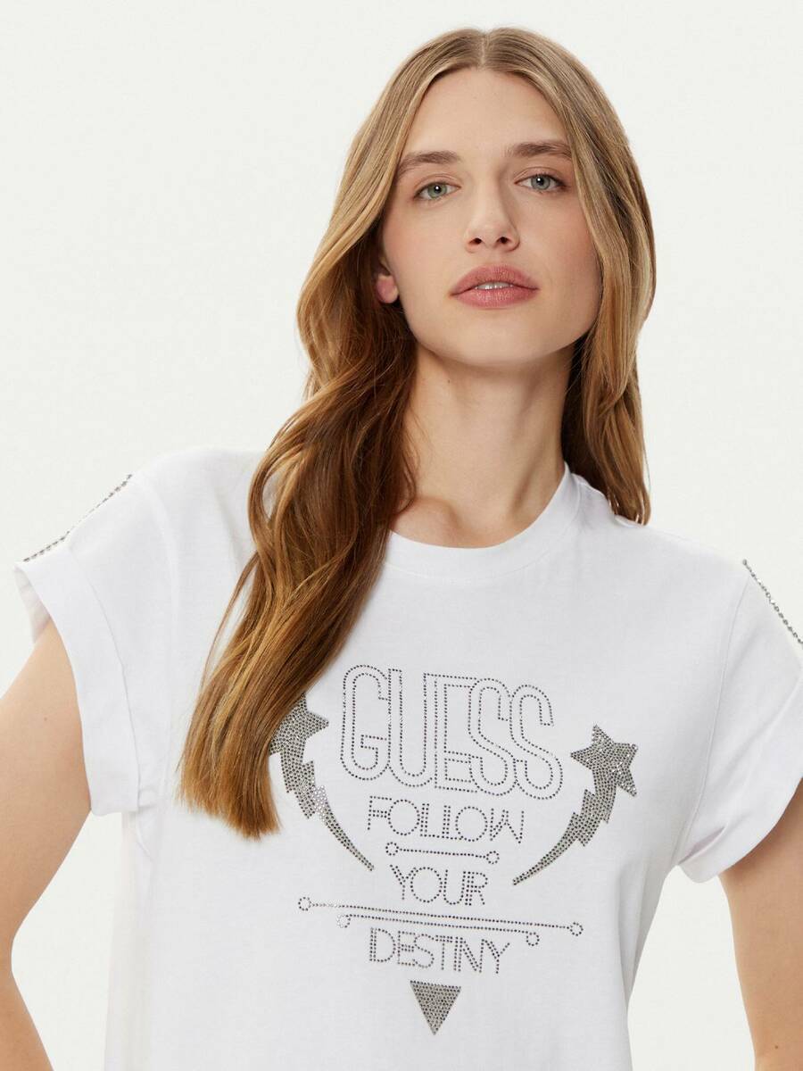 Dámské bílé tričko zdobené kamínky od Guess.
