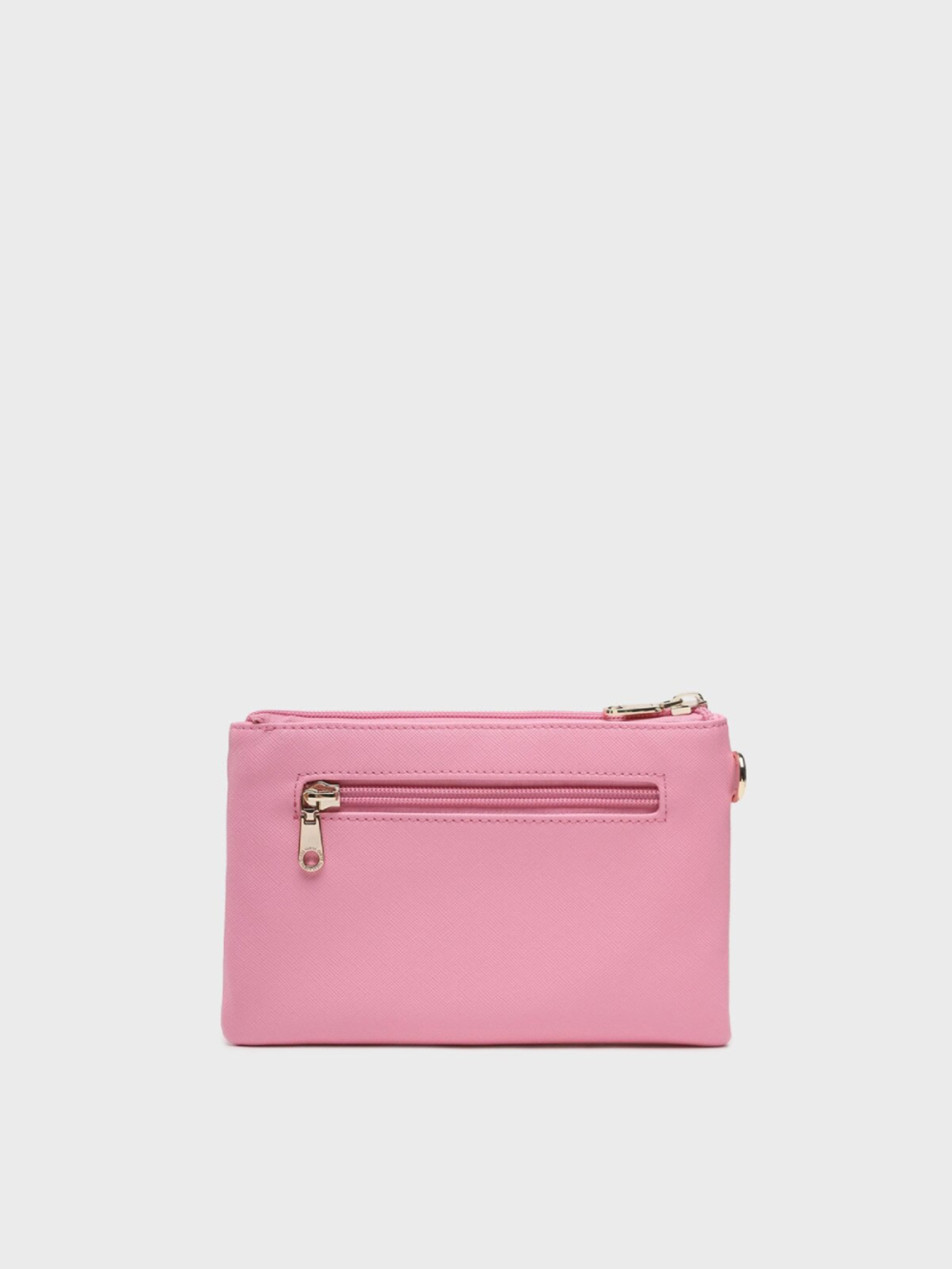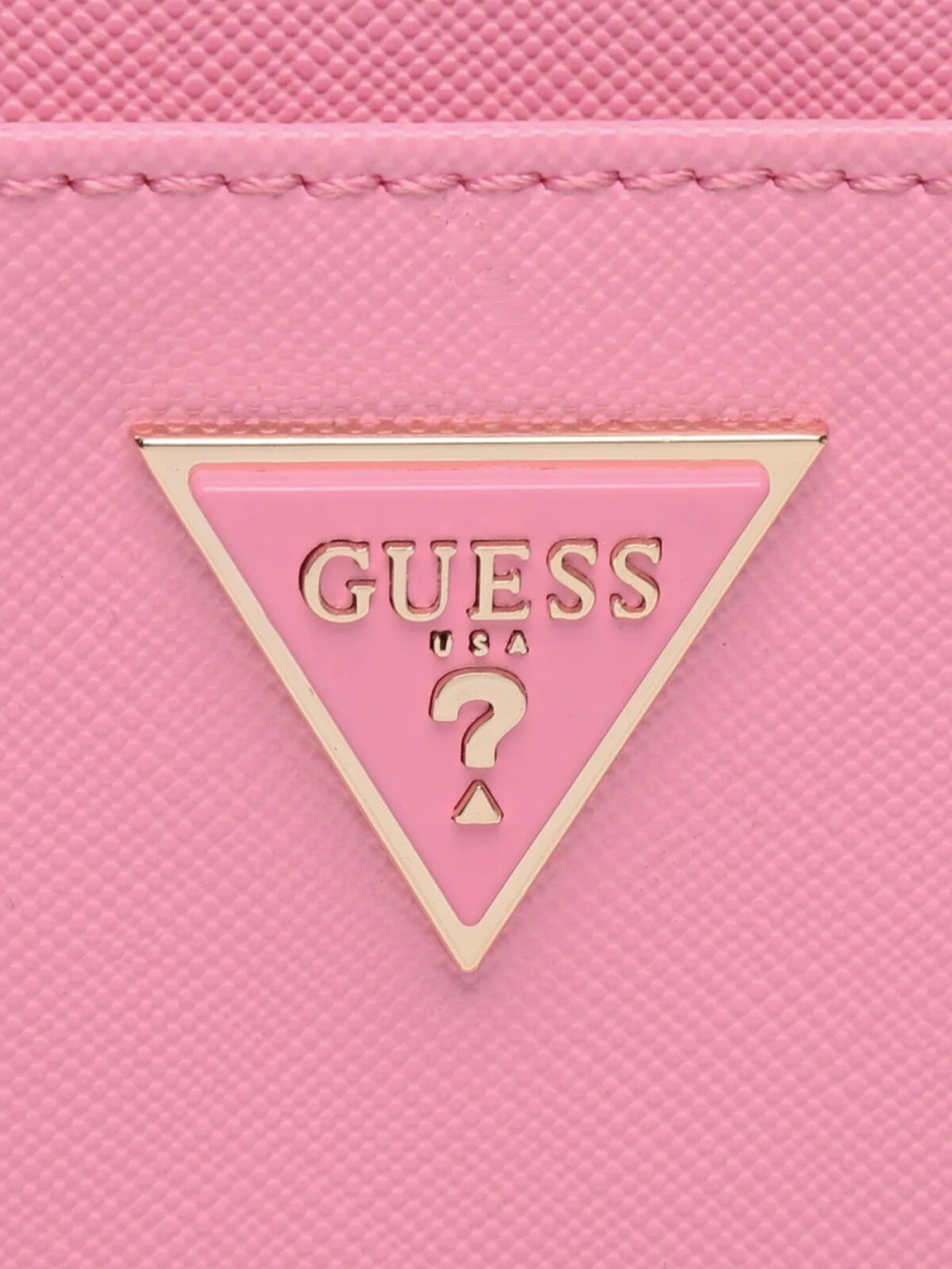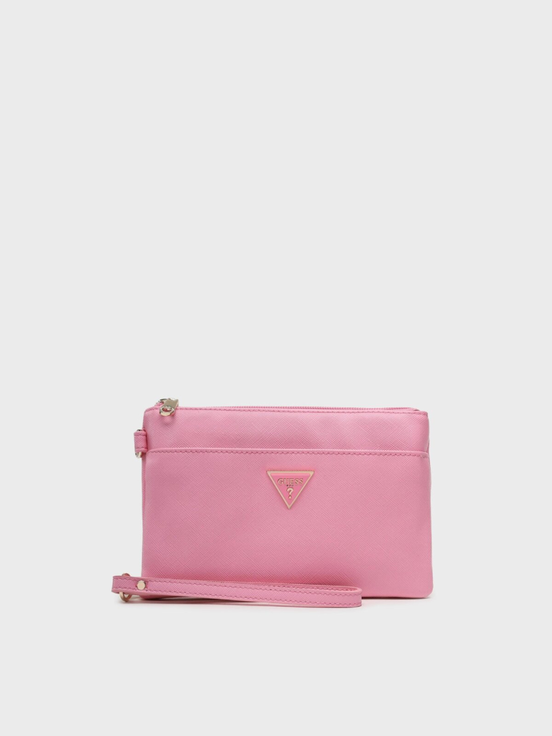 Dámska malá ružová listová kabelka so zlatým kovaním od Guess.