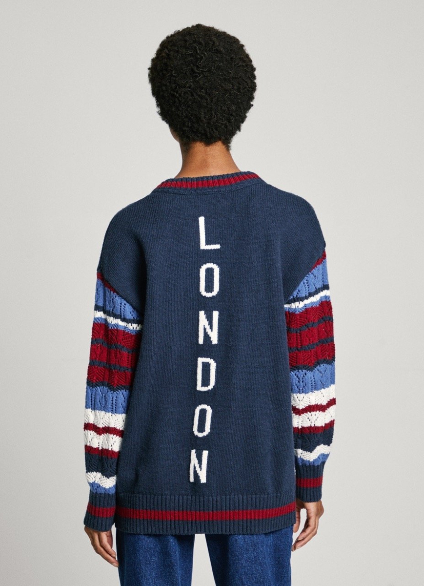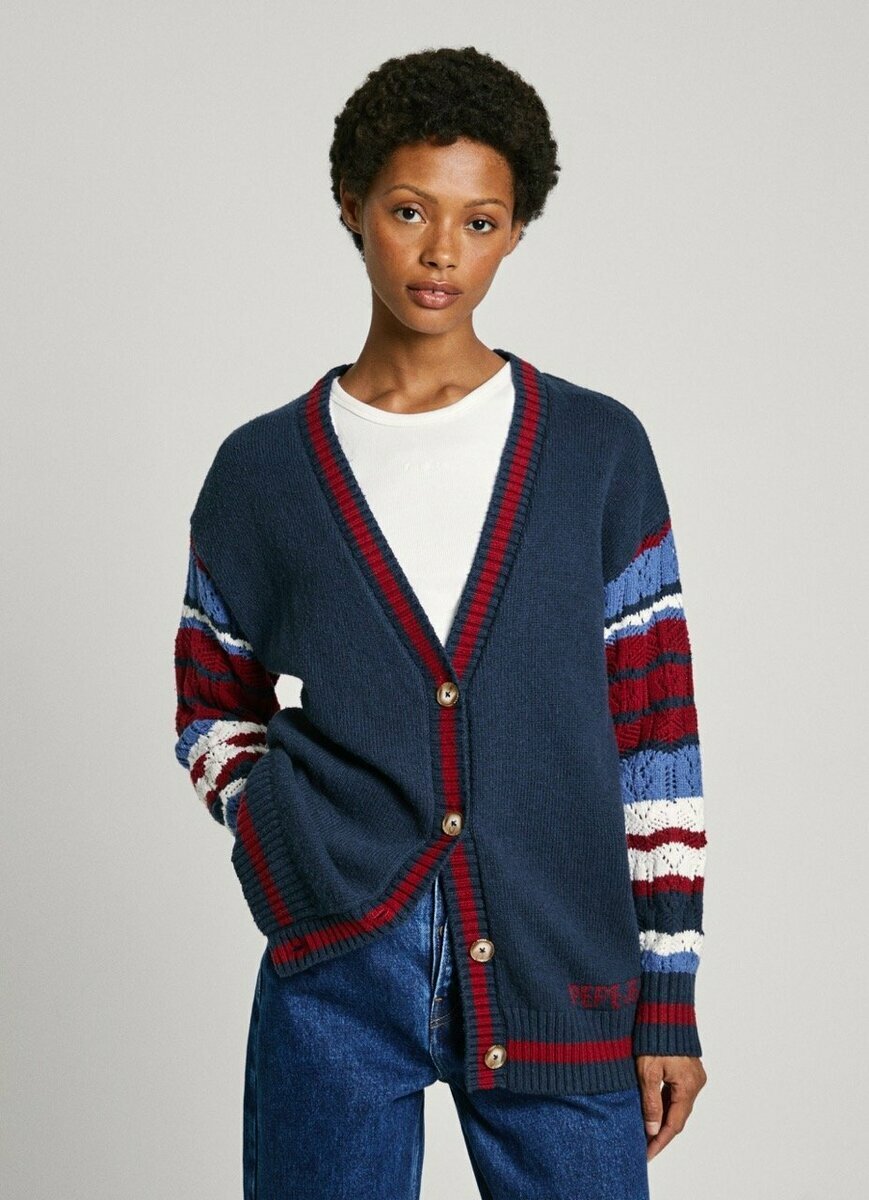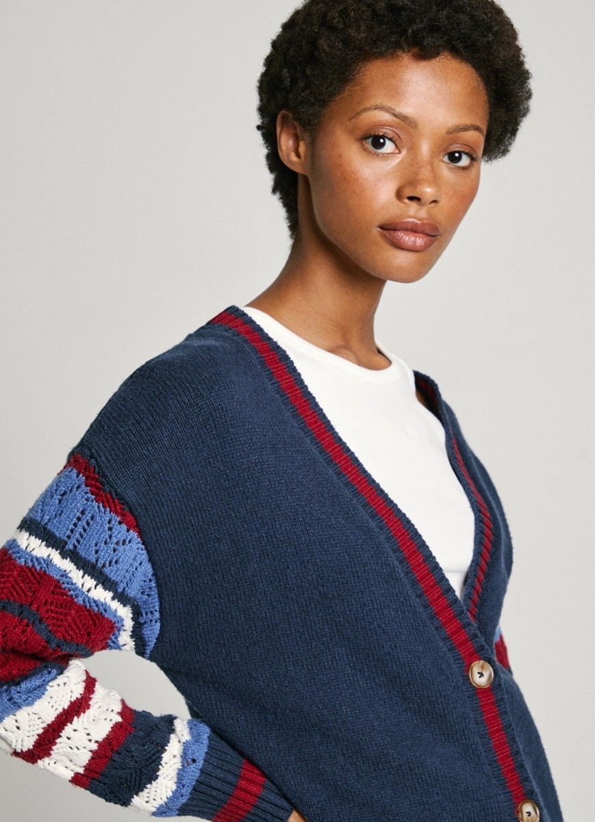 Dlouhý svetr s výstřihem do V a zapínáním na knoflíky.