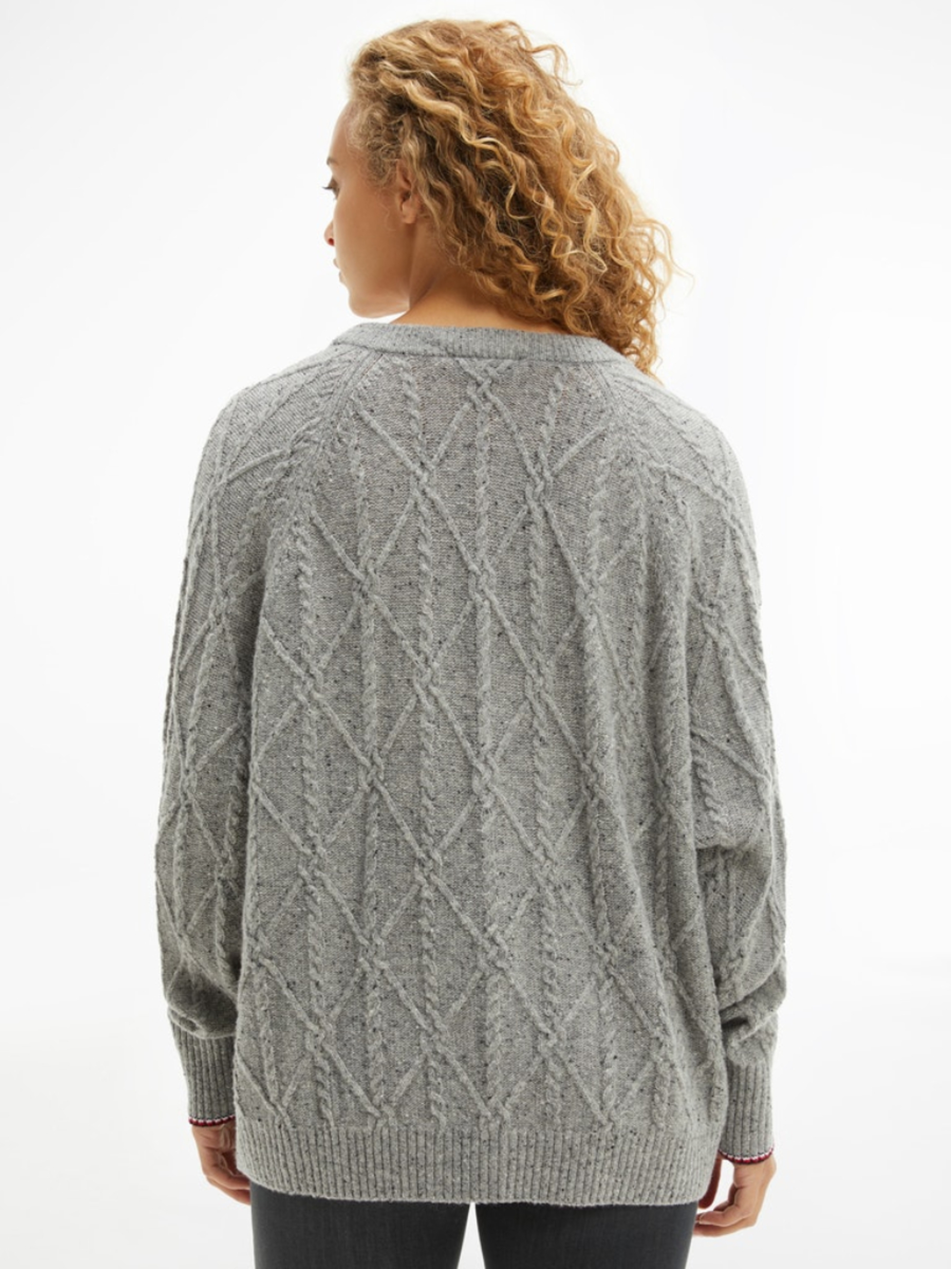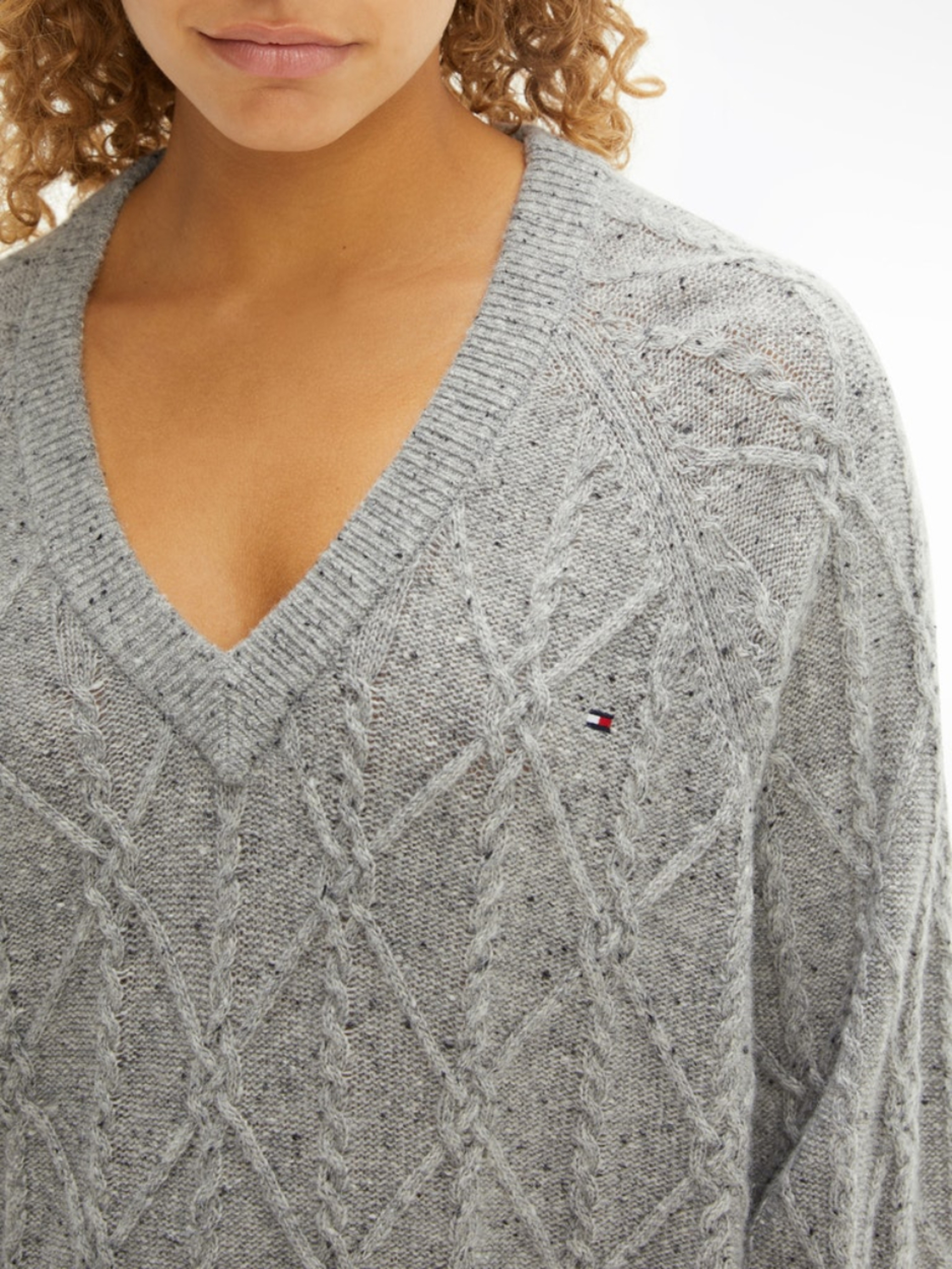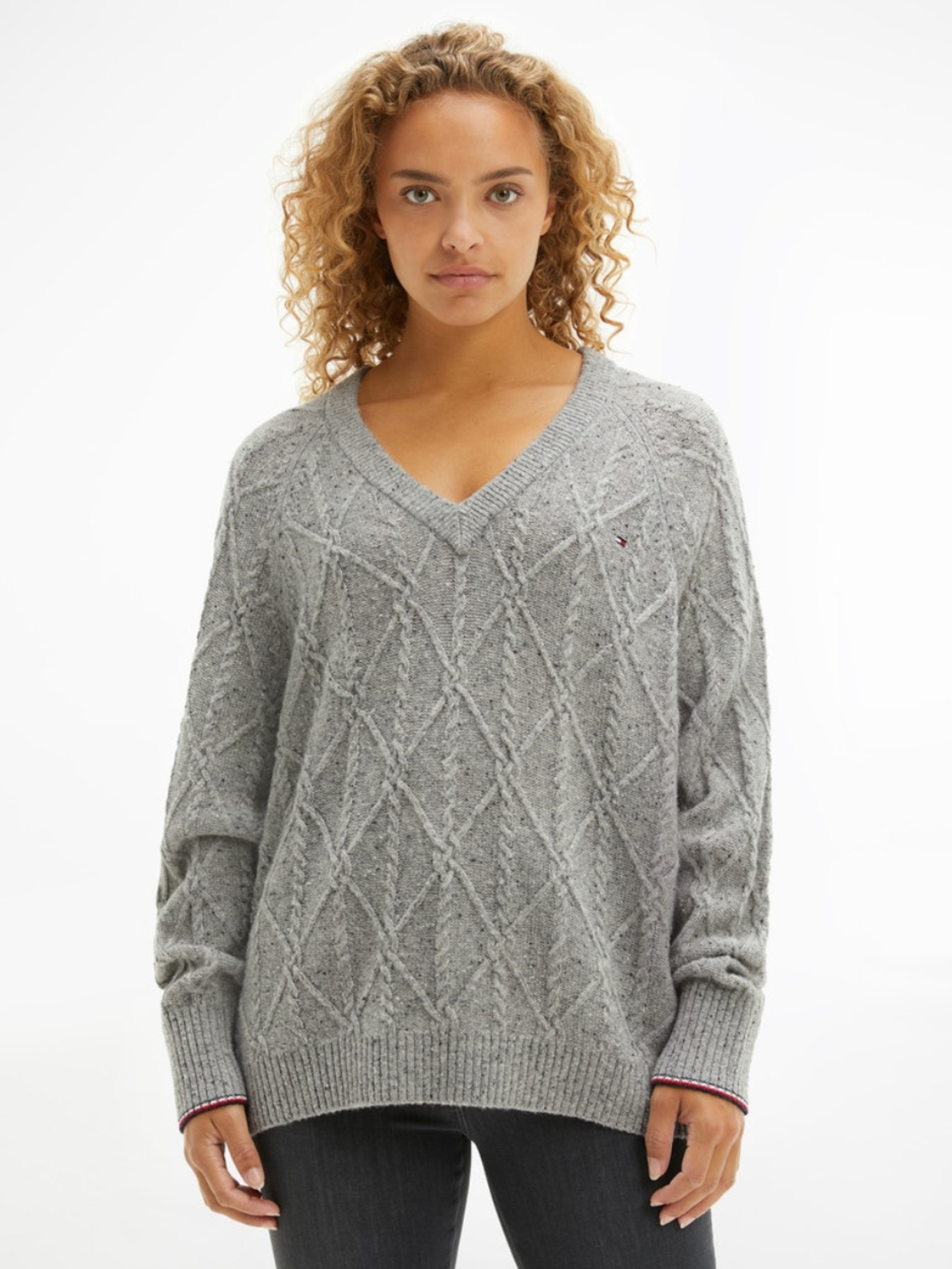 Dámský šedý svetr se vzorem od Tommy Hilfiger.